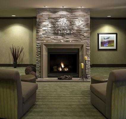 Если в вашей гостиной есть камин, то можно сделать его центральной точкой комнаты. Для этого каминный портал от пола до потолка оформляют кирпичом. Это не только очень красиво, но и практично. Кирпич имеет хорошую теплопроводность, поэтому тепла от камина будет больше, а холодными зимними вечерами будет приятно посидеть у огня с чашечкой чая.