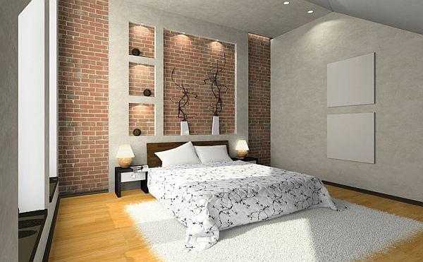 Спальню можно сделать намного уютнее, если её оформить натуральным или искусственным кирпичом. Очень интересно будет выглядеть кладка возле изголовья кровати. Причём её можно оставить естественного цвета, а также покрыть краской. Здесь уже нужно подбирать её в тон цвета стен или создать выигрышный контраст. Кроме этого, декоративный кирпич в интерьере спальни будет смотреться оригинально, если добавить штрих в виде следов штукатурки.