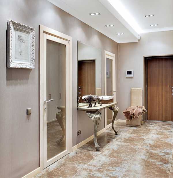 Визуальное увеличение высоты коридора или же прихожей достигается путем использования светлых тонов во время отделки стен, и темных оттенков напольной плитки, которые могут быть представлены имитацией графита, гранита и т.п. Такое напольное покрытие отлично будет смотреться с любым современным стилем оформления дизайна.