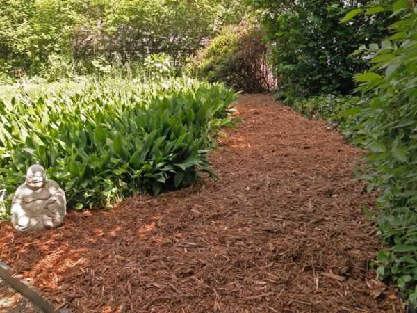 - Из коры деревьев. Также известны как дорожки из мульчи. Этот вариант как раз не отличается долговечностью и обычно рассматривается скорее как временное решение. Износ у таких дорожек очень быстрый, потому их кладут лишь чтобы потом заменить на более традиционные дорожки. Также недостаток в том, что мульча разносится с обувью, приставая к ней – или к шерсти домашних животных, потому может создаться беспорядок.