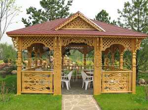 - Яркая, вычурная беседка восточной концепции, с загнутой крышей к верху на деревянных стропилах. Довольно сложная технология строительства!