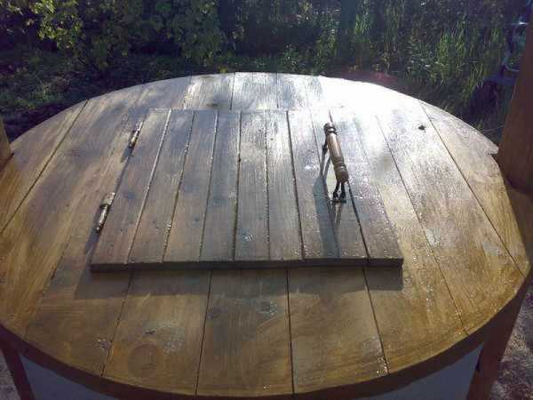 - Более эффективной будет двойная крышка из дерева. Благодаря этому, зимой она не будет промерзать. Она может быть съемной либо откидной – конкретный ее тип удобнее определить при составлении рабочего плана.