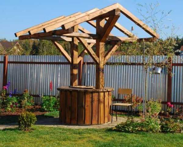 Когда крышка готова, можно заняться декорированием колодца. Существуют разные варианты. Можно установить над колодцем плоскую прямоугольную или округлую крышу. Некоторые изготавливают декоративный домик на столбах.