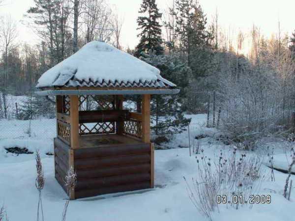 Под закрытым домиком можно спрятать бетонное кольцо колодца. Такой домик имеет металлический каркас из профильной трубы или металлического профиля. Высота домика должна быть примерно на 20 см выше роста человека, чтобы было удобно доставать ведро.