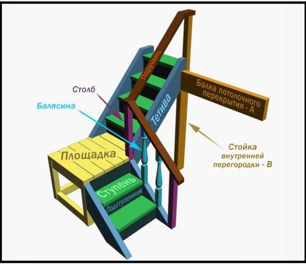 Детали и названия элементов деревянной лестницы на второй этаж дома Вернуться к оглавлениюСодержание материала