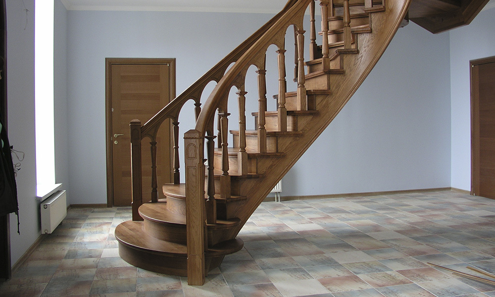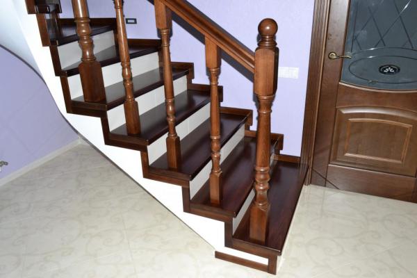 - Забежная лестница из сосны на 90° с коваными перилами