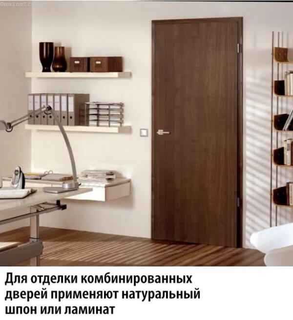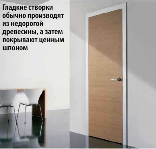 - Шпон. При производстве таких моделей наружные полотна дверей облицовывают шпоном (его изготавливают из ценных пород дерева). Качество этих дверей зависит от совместимости материалов (если шпон из сорта определенного дерева приклеить к основе из иной древесины, дерево рассохнется и станет отслаиваться). Если вы будете делать двери из дерева своими руками – учитывайте это!