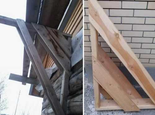 Иногда одну стойки с одной стороны делают вертикальными, без наклона. Это позволяет устанавливать их ближе к стене, настил тогда располагается ближе к стене. В некоторых случаях это удобно — например, при конопатке, покраске, профилактической обработке.