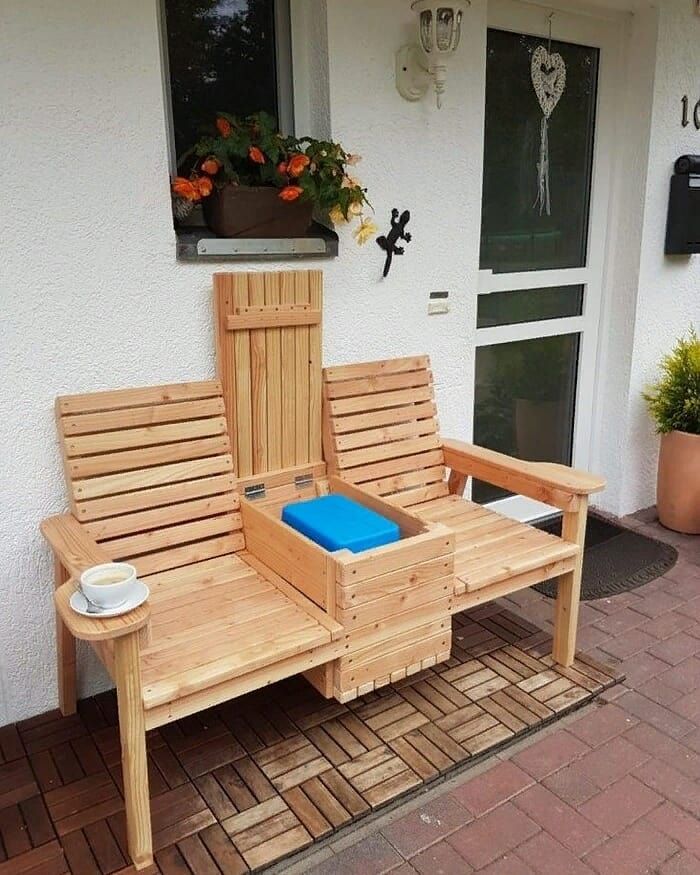 Очень хорошим вариантом будет изготовление придомовой скамьи-сундука. Делается такой предмет мебели очень просто. Для начала необходимо собрать длинный ящик высотой около полуметра, а после приделать к его крышке спинку. Выходит место для хранения различных предметов, к примеру, садового инвентаря, которое по совместительству работает и скамейкой для отдыха. Если у мастера имеются навыки резьбы по дереву, можно украсить основную коробку интересными элементами и сделать похожие рисунки на спинке скамьи.