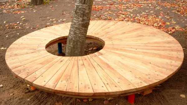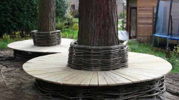 Или, отказавшись от спинки и разместив скамейку подальше от ствола, разместить во внутреннем пространстве красивый цветник.