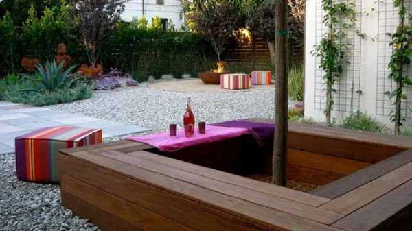 Интегрируйте в скамейку контейнеры для цветов или высокие грядки.
