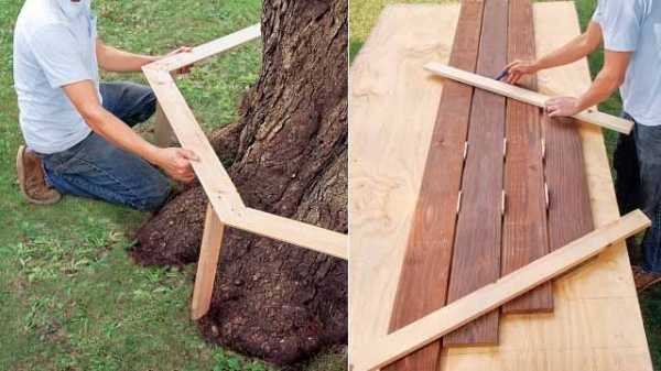 Соберите скамейку на плоской поверхности, не закрепляя две противоположных секции. Установите скамейку около дерева, если надо, откорректируйте плоскость, выбирая грунт под ножками скамейки. Скрепите все секции.