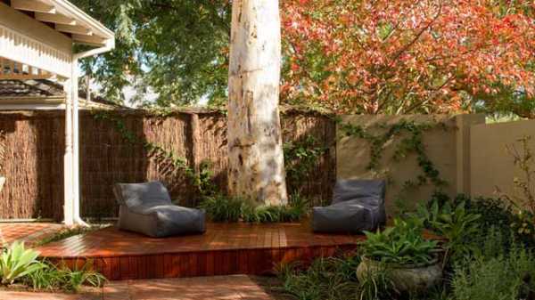 Небольшое пространство под деревом с помощью простой скамейки-патио превратилось в излюбленную зону отдыха в саду.