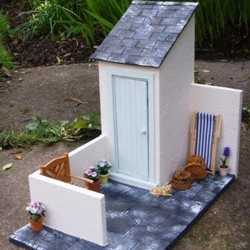 - Домик — эта конструкция традиционно теплее и прочнее скворечника. Для создания такого проекта дачного туалета необходим минимум материалов. Уникальная форма позволяет сделать художественную отделку.