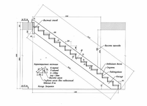 Детализированный чертеж одномаршевой деревянной лестницы