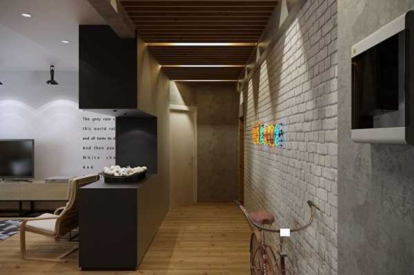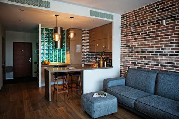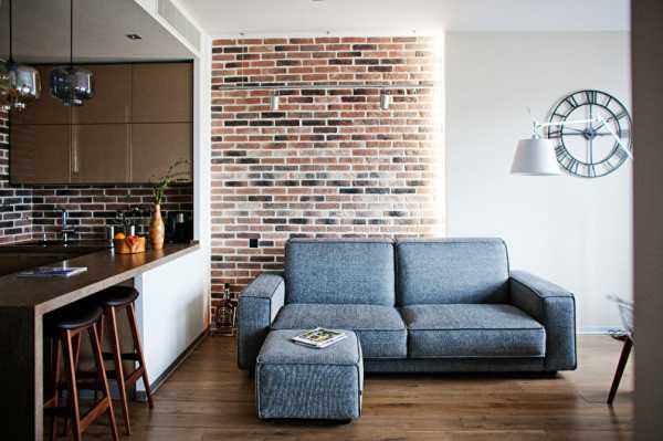 Здесь царит простота и изящество. Жилое пространство выглядит визуально открытым и просторным за счет отсутствия перегородок и простенков. Кирпичная кладка гармонично сочетается с ультрасовременной техникой и изысканной мебелью. Обилие серого цвета смягчается за счет освещения, использования натурального дерева в отделке, яркого декора. Мебель удачно зонирует пространство, украшает помещение, она максимально проста и комфортна. Небольшая кухня отделена барной стойкой. В качестве напольного покрытия, в основном, паркет. Изюминкой данного проекта является обилие натуральных материалов в каждой комнате, включая кухню и ванную.