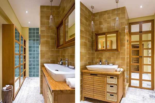 Яркая душевая кабина — прекрасный способ расставить акценты в помещении. Стенки душевой кабины, сделанные из стекла, создают визуальный эффект ширины небольшой по размеру ванной комнаты. Душевую можно отгородить перегородкой из бетона или стекла. Зрительно увеличить пространство помогают также зеркала большого размера.