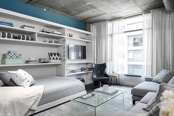 - Зонирование. Идеальный вариант – помещение, свободное от перегородок, оно должно просматриваться полностью. Особняком стоит санузел и спальня. Бытовое оборудование и вещи должны быть спрятаны в шкафы и ниши. Если у вас высокие потолки, можно создать «открытый этаж» – дополнительную зону отдыха.