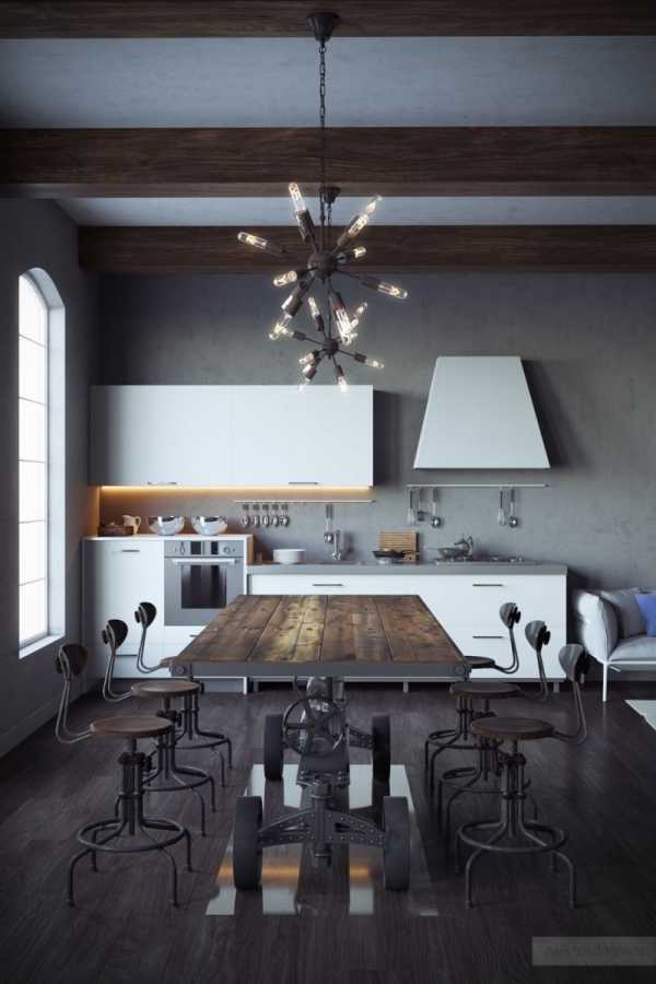 Кухонную зону часто совмещают с гостиной. В кухне либо располагают старое оборудование а-ля 50-е, либо оборудуют в стиле хай-тек. Отлично вписываются блестящие хромированные поверхности и профессиональное оборудование. Яркие акценты не приветствуются – кухня не должна концентрировать на себе внимание.