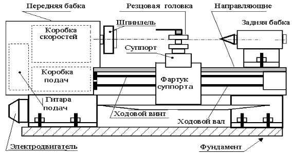 Основные части и узлы токарного станкаТокарный станок, оснащенный специальным устройством для нарезания резьбы, называется токарно-винторезным.