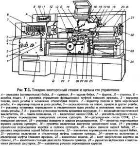 | 1 | Станина | Соединяет в один агрегат все узлы станка, на ней жестко установлена передняя бабка, а также коробка подач. Станина имеет направляющие для перемещения задней бабки, суппорта с фартуком. |