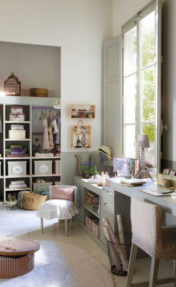 «Спальня для девочки-подростка разделена на три зоны: зона отдыха, зона для учебы и гардеробная. Каждая зона имеет свои собственные решения для хранения вещей,» говорит дизайнер этого интерьера Olga Gimeno. — «Поскольку комната довольно маленькая, мы постарались использовать каждый уголок с пользой — пространство под окном (где образовался стол-комод), под кроватью (для хранения сезонных вещей и книг), место возле кровати (между кроватью и стеной расположен небольшой прикроватный столик, на котором можно хранить всяческие мелочи или поставить вазу с цветами).