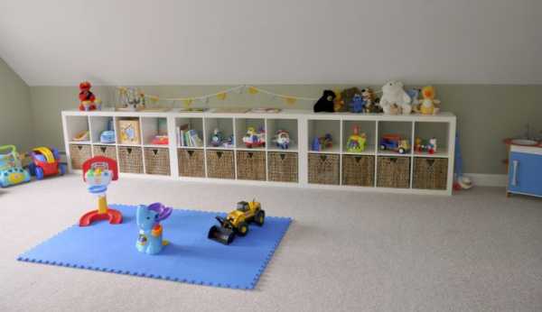 В игровой зоне можно расположить шведскую стенку и различные секции, где бы могли храниться игрушки.