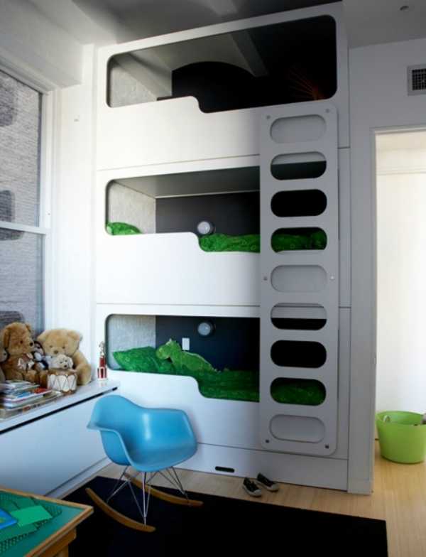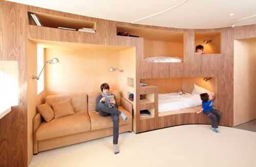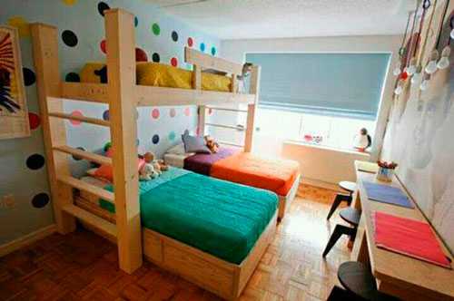 Если необходимо разместить более трех детей в одной комнате, то используйте симбиоз из нескольких вариаций спальных мест.