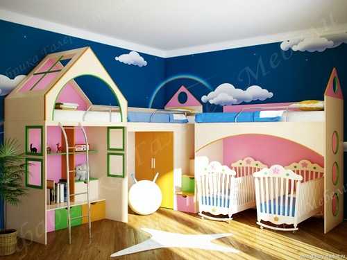При оформлении комнаты для разнополых детей следует учитывать их возраст. Если все три ребёнка ещё маленькие, то их спальные места можно расположить рядом, выделив лишь цветом корпуса или текстиля. Как правило, это розовый — для девочек и голубой — для мальчиков.