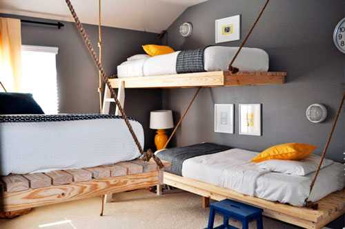 Например, используя в комнате кровать или диван вместе с двухъярусной кроватью.