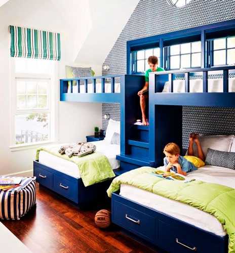 Кровати лучше располагать в нескольких ярусах — мальчишкам это будет интересно. Что касается колористического решения интерьера, то это может быть синий, зелёный цвет, а также все оттенки коричневой гаммы.