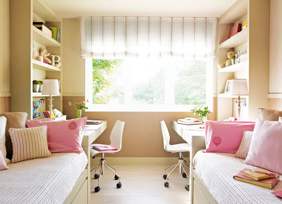А вот рабочую зону можно объединить, поставив один большой письменный стол на два места.