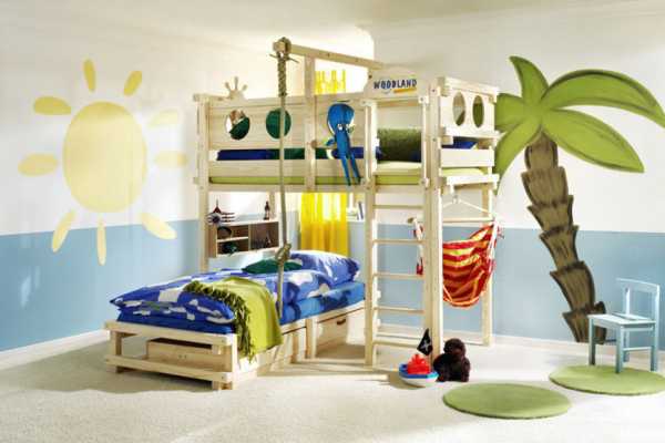 1. Двухуровневые сооружения, оборудованные ящиками, шкафчиками и, полочками стали популярны благодаря своей эргономичности. Они позволяют совместить сразу несколько зон в одном месте, освобождая дополнительное пространство для активных и подвижных игр, которые так необходимы детям. Ассортимент широк, и найти в магазине подходящее по дизайну изделие не составит труда. А простую конструкцию с параллельным расположением спальных мест можно изготовить самостоятельно.