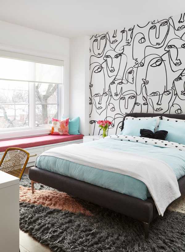 Черно-белые обои с оригинальным рисунком являются фоном для ярких деталей интерьера в комнате подростка