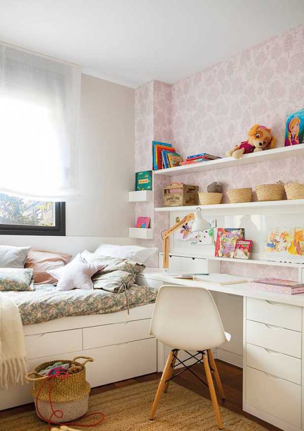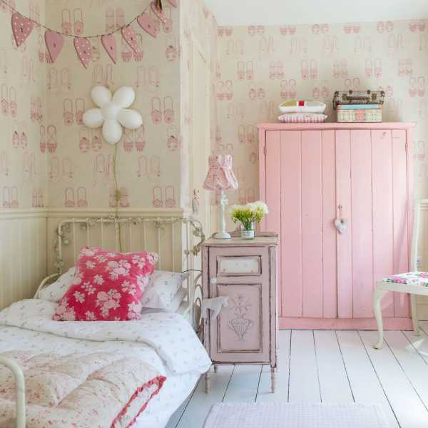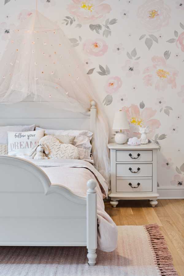 Неброский цветочный рисунок на обоях создает легкую и романтическую обстановку в комнате девочки