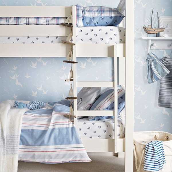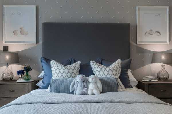 Серо-голубой тон обоев задает общий колорит оформления интерьера детской комнаты