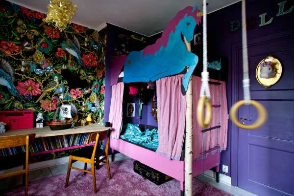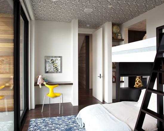 Необычный дизайн детской комнаты создан благодаря оклейке яркими обоями протолка, а однотонными — стен