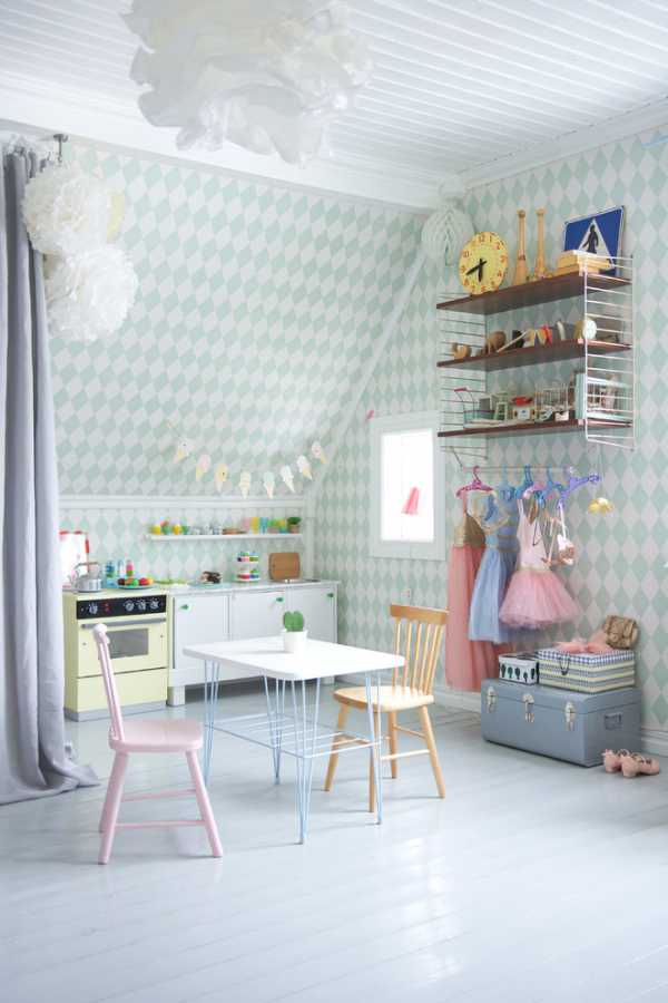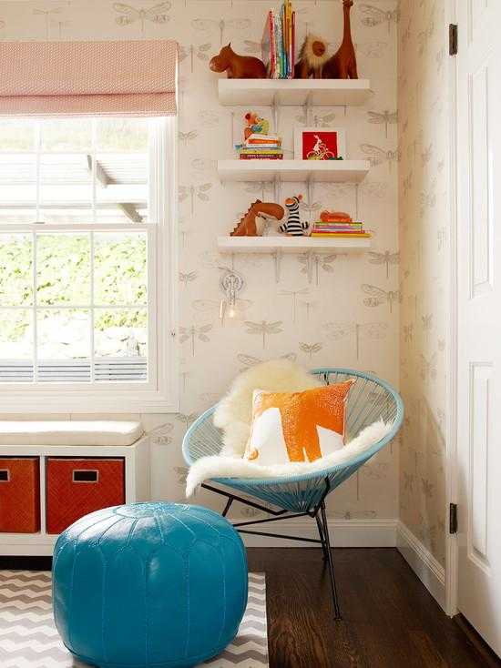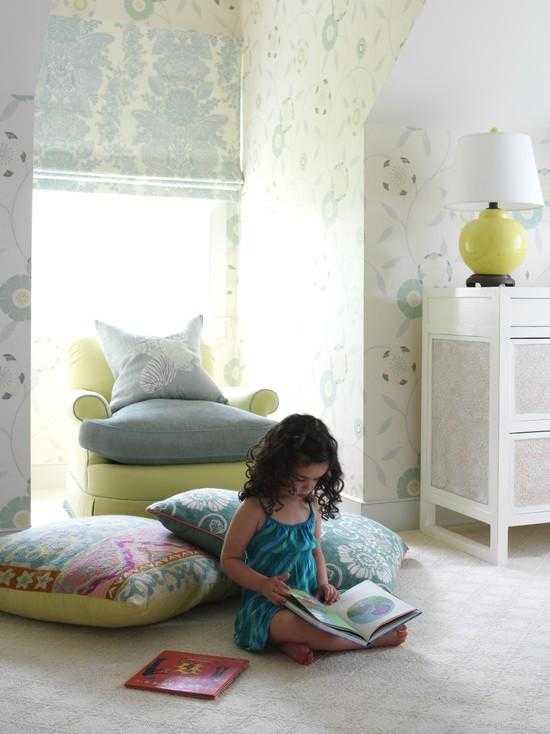 Цвет обоев в детской комнате подчеркивается с помощью удачно подобранных аксессуаров