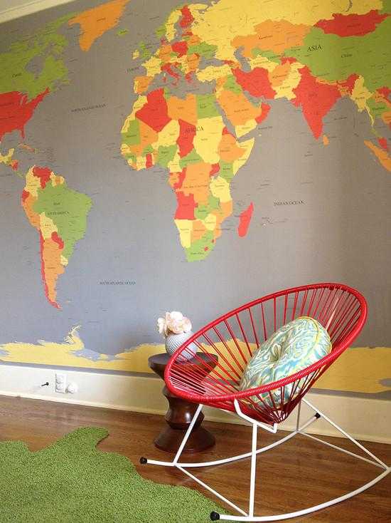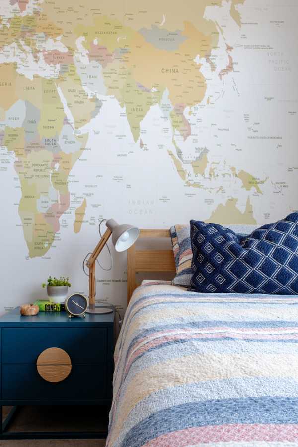 Географическая карта во всю стену вместо привычных обоев — отличная идея дизайна комнаты подростков