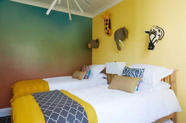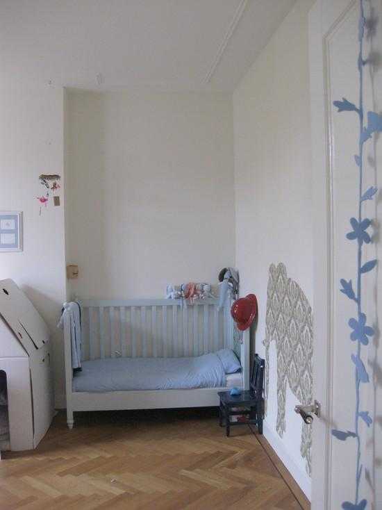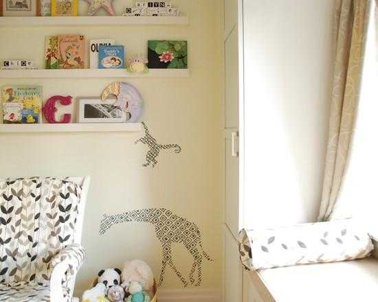 Украшением светлой стены служат вырезанные из пестрых обоев силуэты африканских животных