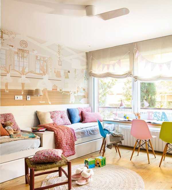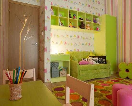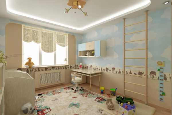 Самым удобным и простым способом внесения в детское помещение позитива, психологи считают отделку стен разными обоями. При выборе оригинальных и ярких шпалер, можно провести разделение пространства на несколько зон. Этот прием актуален в том случае, если одну комнату делят сразу несколько малышей. К примеру, в нежных розовых оттенках можно оформить «уголок» для девочки, а для мальчика подобрать синие и серые цвета.