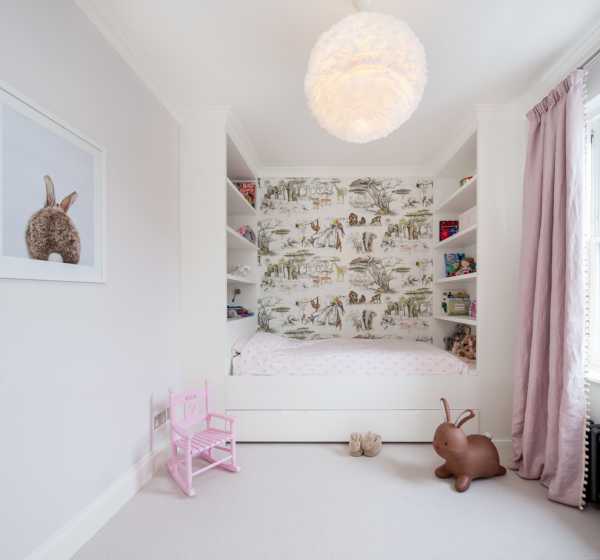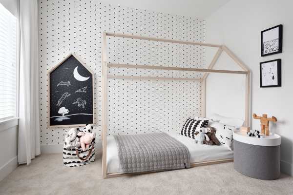 Одна из стен в светлом интерьере детской комнаты оклеена обоями с однотонным принтом на белом фоне