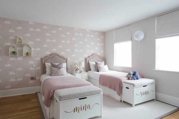 Детская комната для девочек оформлена с помощью нежно-розовых обоев с неброским рисунком