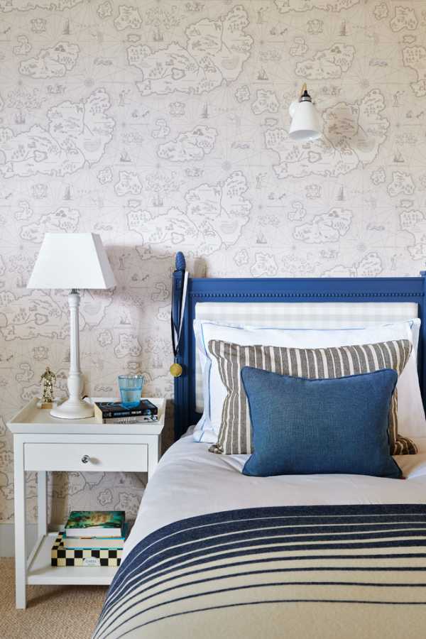 Оригинальный дизайн детской комнаты создан при помощи оклейки стен географическими картами вместо обоев