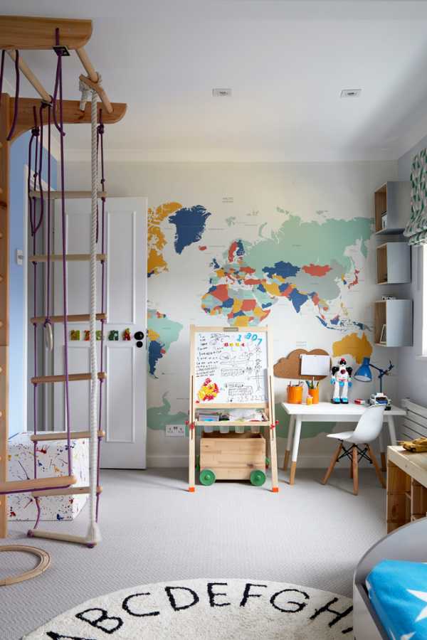 Детскую комнату в стиле модерн украшают обои в виде политической карты мира