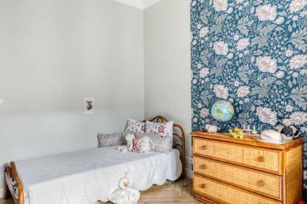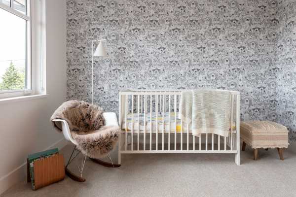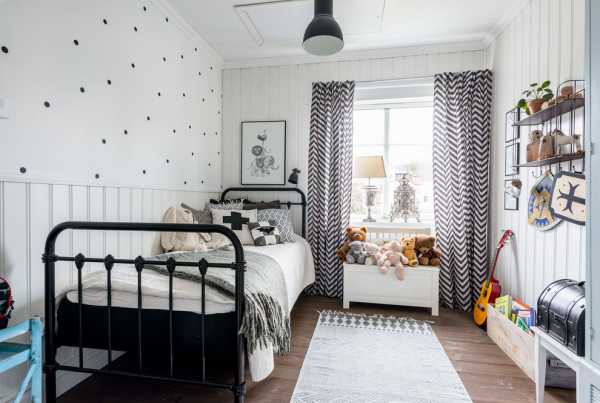 Одна из стен, оклееная черно-белыми обоями с цветочным принтом, придает оригинальности помещению детской