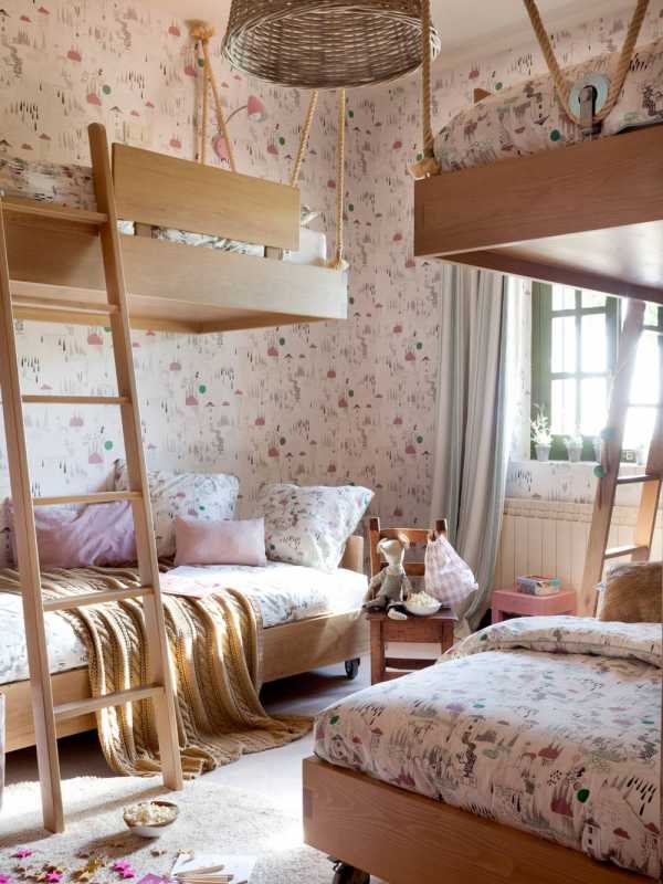 • Детская комната с высоким потолком. Такие детские чаще можно встретить в загородном доме. Чтобы пространство такой комнаты для ребенка стало более уютным, нужно подбирать для нее обои с горизонтальным рисунком, а лучше использовать сочетание на стенах двух видов обоев, разделенных каймой. Можно прибегнуть к небольшой хитрости – выбрать покрытие для потолка на один-два тона темнее, чем для стен.
