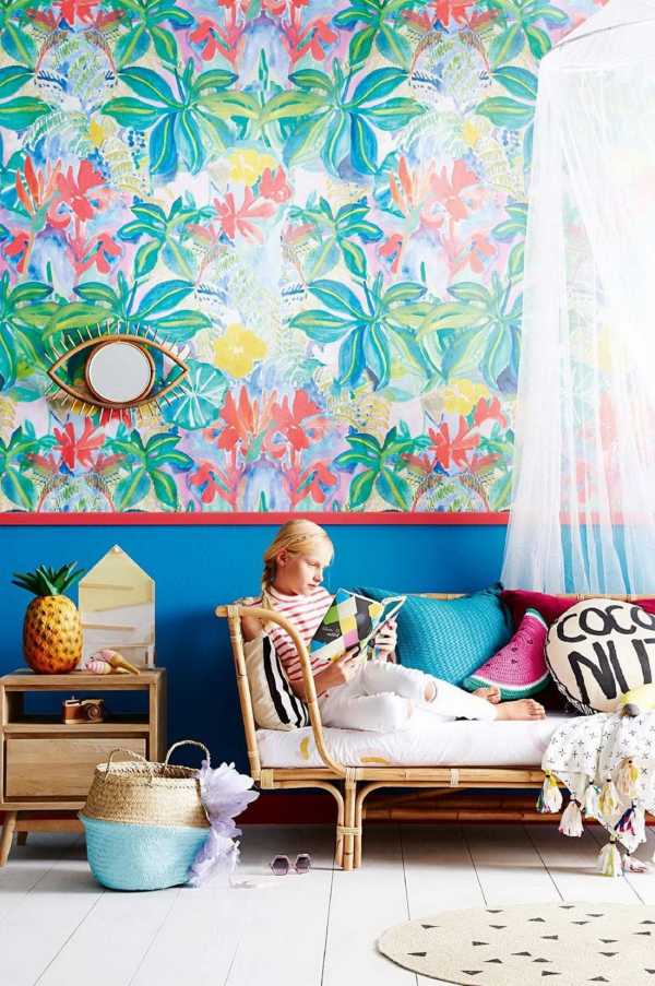 Яркие тона обоев повторяются в предметах интерьера, создавая радостную атмосферу в детской комнате
