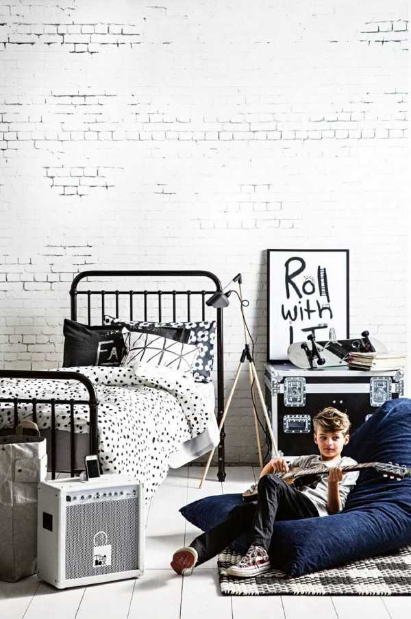 Стильный интерьер в комнате подростка можнос оздать с использованием обоев в поперечную черно-белую полоску