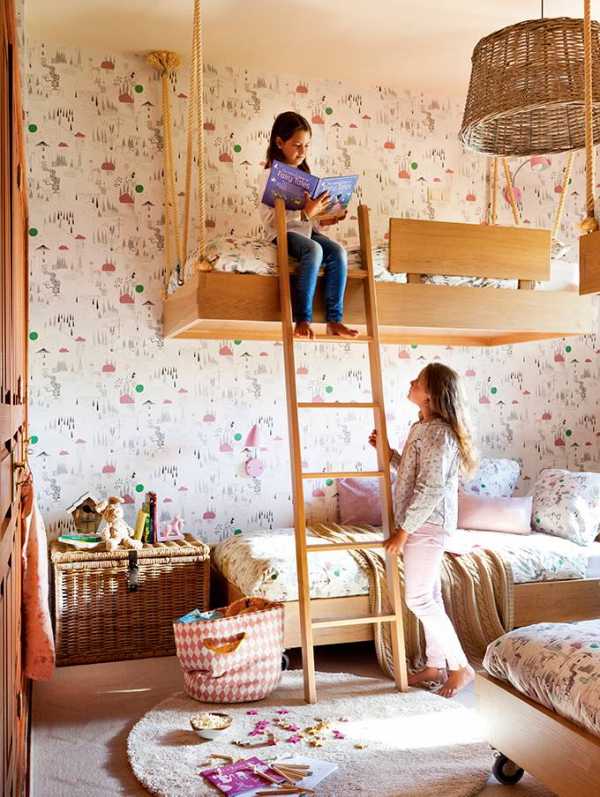 В оформлении интерьера детской использованы светлые обои с пестрым рисунком